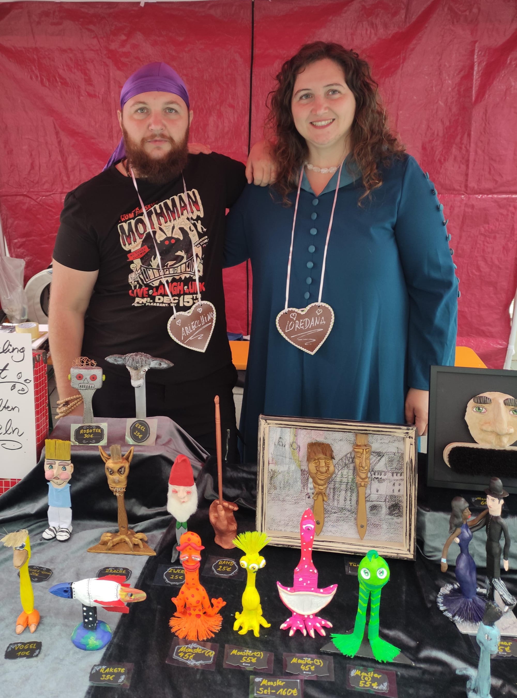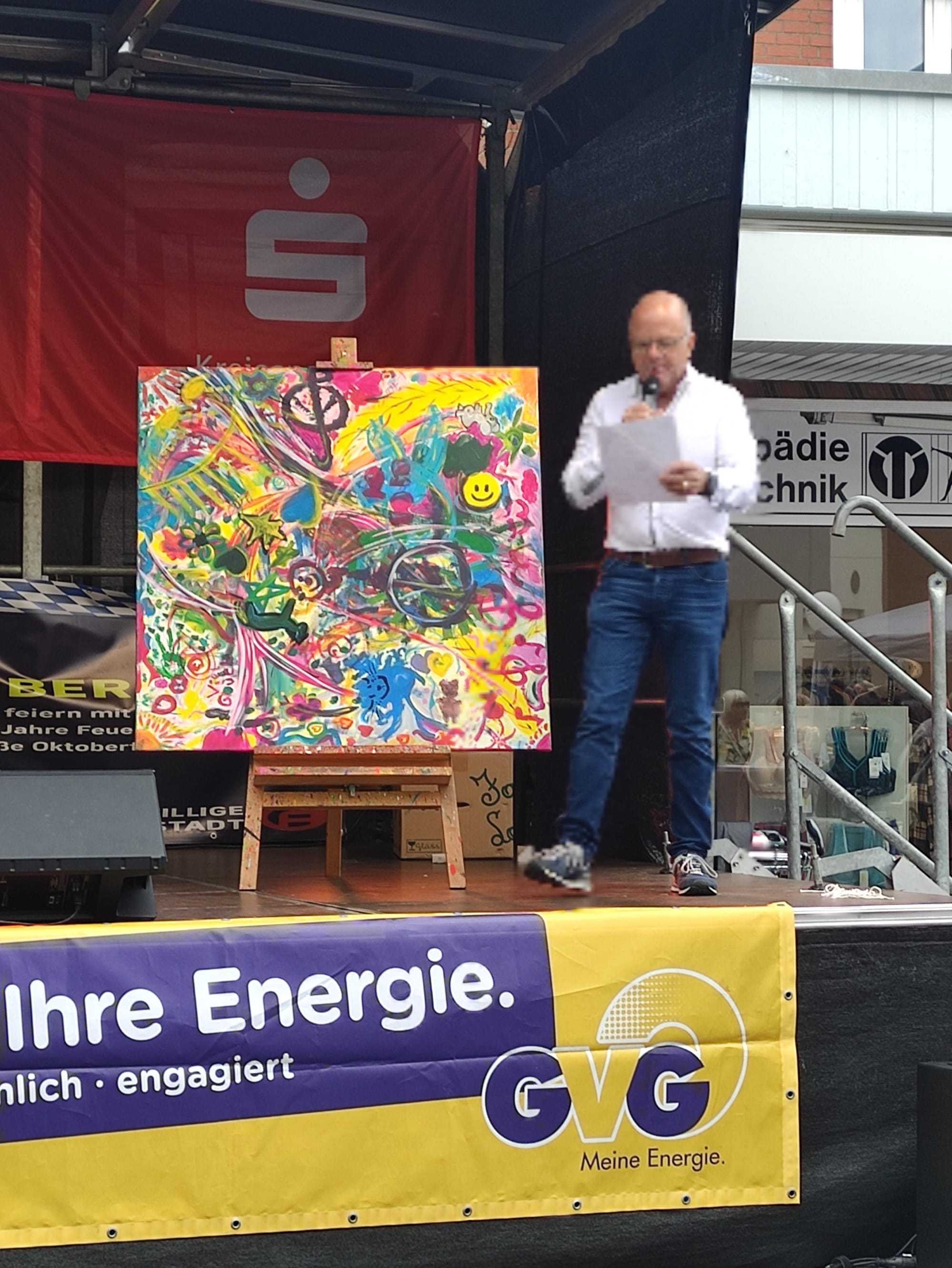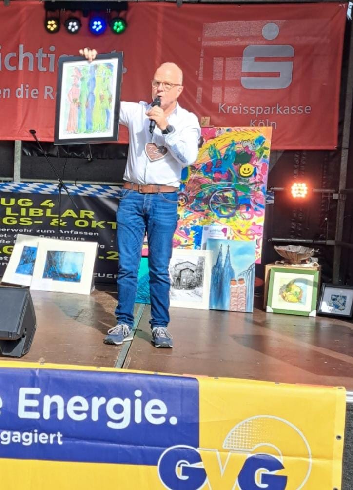 Höhepunkt des Kunstherbstes war das Oktoberfest im ErftstadtCenter Liblar am 27.09.2025. Im Rahmen eines Musik- und Bühnenprogramms wurden Arbeiten der Kunstschaffenden des Künstlerforums zugunsten des Hospiz-Vereins Erftstadt e.V. versteigert. Neben dem Bühnenprogramm gab es auf dem Familienfest auch einige Verkaufsstände der ausstellenden Kunstschaffenden, bspw. Loredana Bursch und Arlecchino Bursch, die u.a. spannende Upcycling-Objekte aus ihrer Werkstatt zum Verkauf anboten.